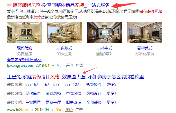 我們百度搜索“裝修風(fēng)格”以出現(xiàn)這兩個(gè)廣告。讓我們比較差異。