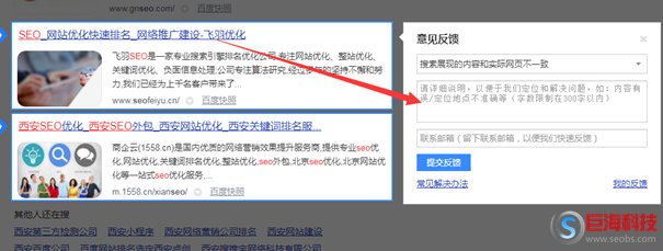 西安優化公司仔細閱讀了下百度的建議了解到,原入口雖然不能用,但用戶可以通過百度搜索引擎頁面底部的“用戶反饋”進行提交處理。于是試了下手頭上要處理的站點,果然反饋成功了,不過這種方法處理的周期較長,一般1~2周不等。如下圖示范: