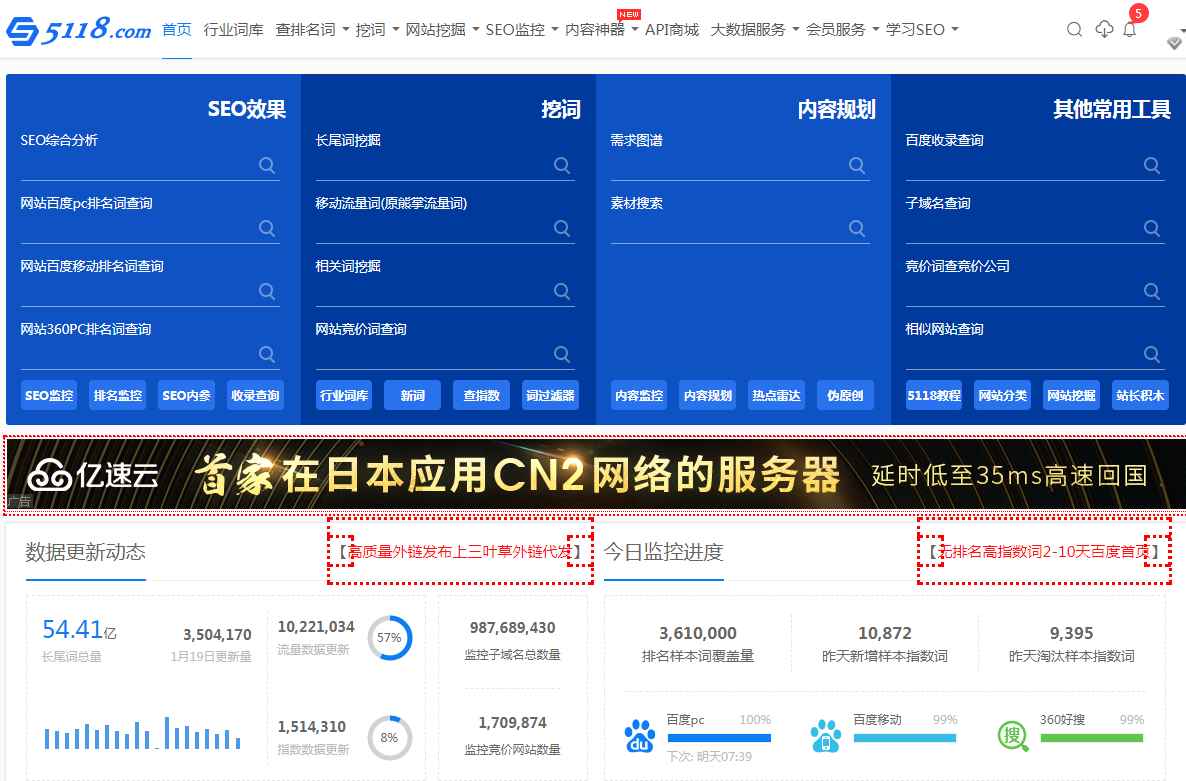 5118是一款SEO關(guān)鍵詞工具,專門做營(yíng)銷型網(wǎng)站等各類SEO網(wǎng)站關(guān)鍵詞分析的,分為長(zhǎng)尾詞庫、競(jìng)價(jià)詞庫、熱門關(guān)鍵詞庫、行業(yè)關(guān)鍵詞庫以及網(wǎng)站詞庫等,還能預(yù)測(cè)熱門關(guān)鍵詞以及網(wǎng)站綜合分析等
