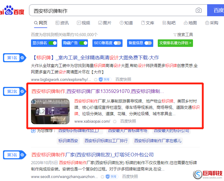 以上就是西安網(wǎng)站優(yōu)化巨海科技提供的近期案例,更多關(guān)于“西安標(biāo)識牌制作等”的相關(guān)效果,巨海SEO可以讓潛在有需求的客戶及時找到你,投入成本低回報率高,想了解西安標(biāo)識牌制作等相關(guān)的更多相關(guān)內(nèi)容盡在巨海科技!請聯(lián)系我們的在線客服,希望對你有所幫助。